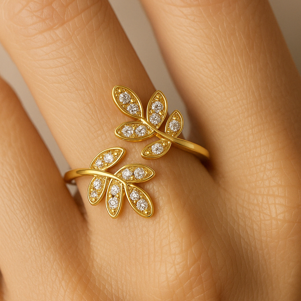 Elegantní, nastavitelný prsten se třpytivými detaily listů. Ideální jako dárek nebo pro chvíle, kdy chcete zazářit.