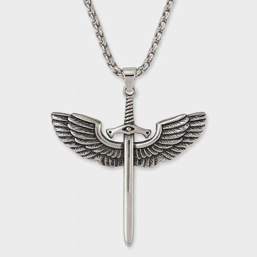 - Massivt sverdanheng med utspente vinger – symbol på beskyttelse og rettferdighet